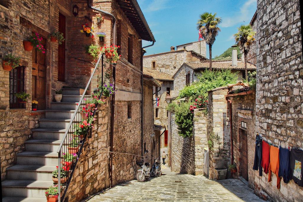 Gubbio (provincia Perugia, región Umbria). Jedno z najkrajších stredovekých mestečiek Talianska, posadené do skaly, v strmých svahoch Monte Ingino. Svojimi typickými kamennými domčekmi v úzkych uličkách, malými trattoriami, obchodíkmi s majolikou či bizarnou lanovkou (koše pre dvoch, do ktorých sa nastupuje a vystupuje za jazdy), ktorá prechádza vysoko nad strechami domov, priťahuje veľa turistov.